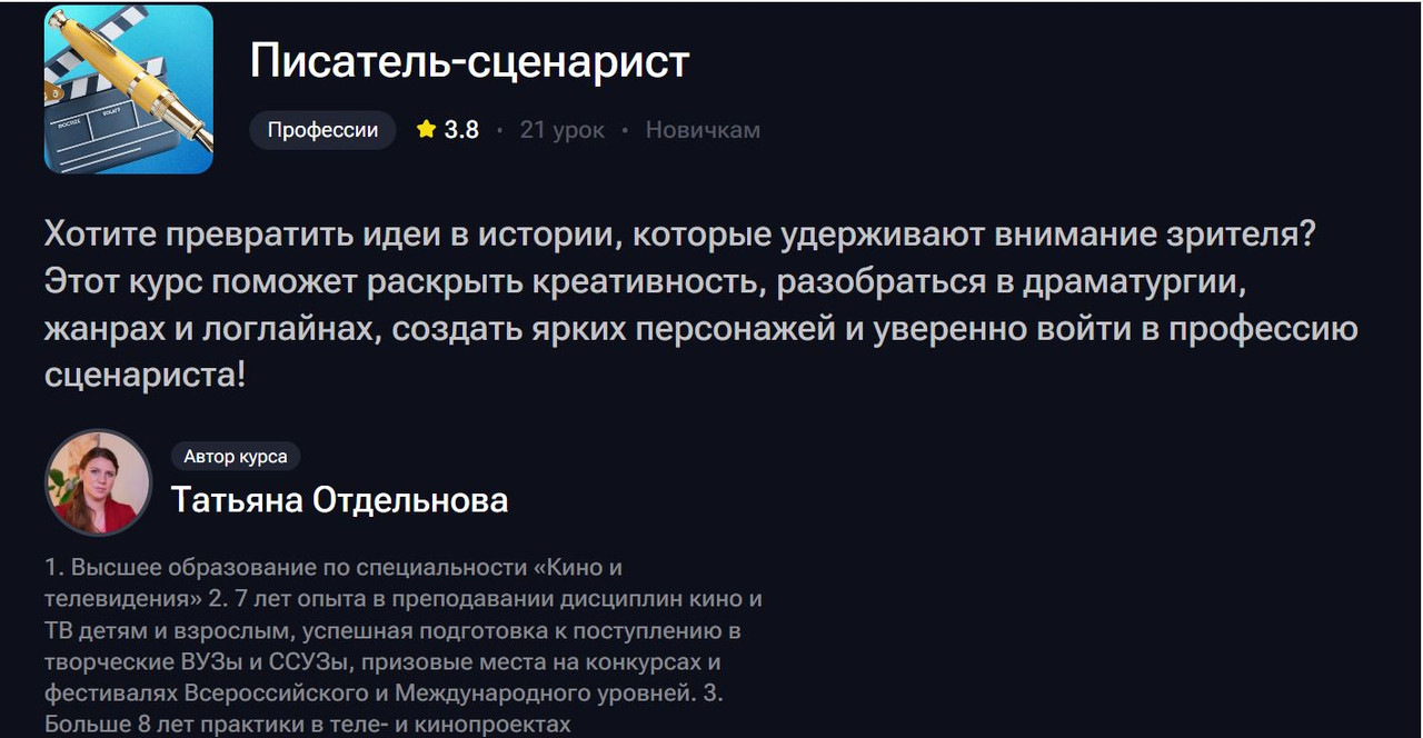 Программа Татьяны Отдельновой посвящена ключевым аспектам создания сценария — от зарождения идеи до построения сюжетной структуры, которая держит зрителя до финальных титров .