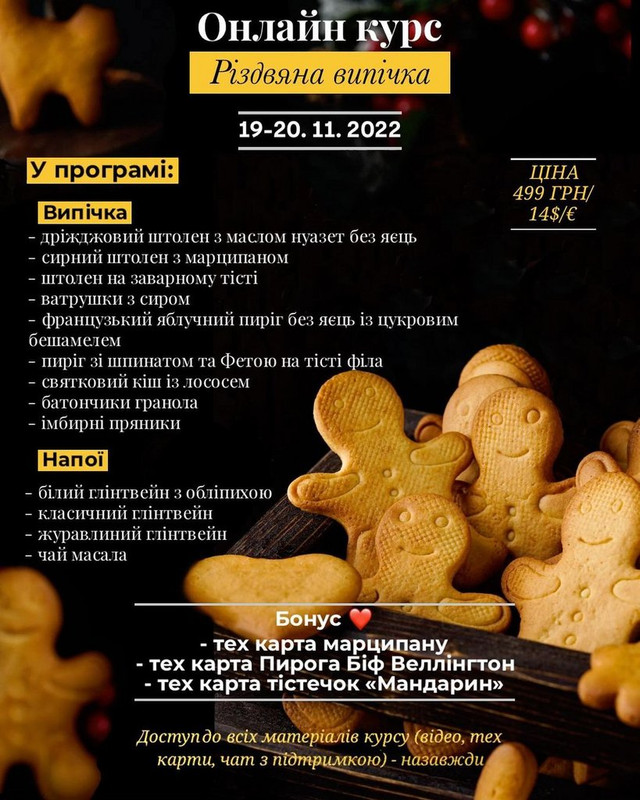 Курс «Рождественская выпечка» полностью адаптирован под ручной замес с приготовлением в любой домашней духовке, без специального оборудования. Изделия получаются c приемлемой себестоимостью и из доступных продуктов, которые есть в каждом магазине.